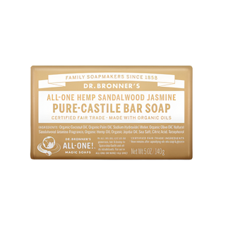 Warm and woody with fresh jasmine notes – Dr. Bronner's Sandalwood Jasmine Pure-Castile Bar Soap is made with certified fair trade ingredients and organic hemp oil for a soft, smooth lather that won't dry your skin. 100% biodegradable in a 100% post-consumer recycled wrapper.
